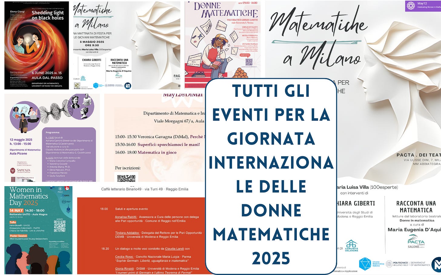 Maggio è il mese in cui si celebrano i risultati conseguiti dalle donne matematiche e questo perché il 12 maggio è la data di nascita di Maryam Mirzakhani, prima donna a ricevere la Medaglia Fields. Chiara de Fabritiis ha raccolto per voi dal sito May12 gli eventi che si svolgono in Italia (se siete a conoscenza di uno che manca in questa lista, scrivete a c.defabritiis@univpm.it allegando i dettagli e la locandina e lo inseriremo). Tutti gli eventi internazionali li trovate su questa pagina.