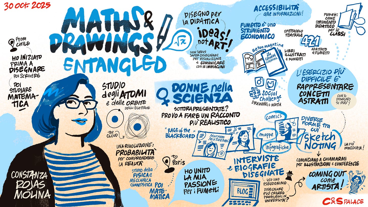 Disegno di copertina del magnifico Gabriele Peddes che è poi il commento grafico alla conferenza di Lucca della matematica e illustratrice Constanza Rojas-Molina, una nostra proposta sia per il Festival della Scienza che per il Comics&Science Palace. Credits: Gabriele Peddes per Symmaceo Communications.